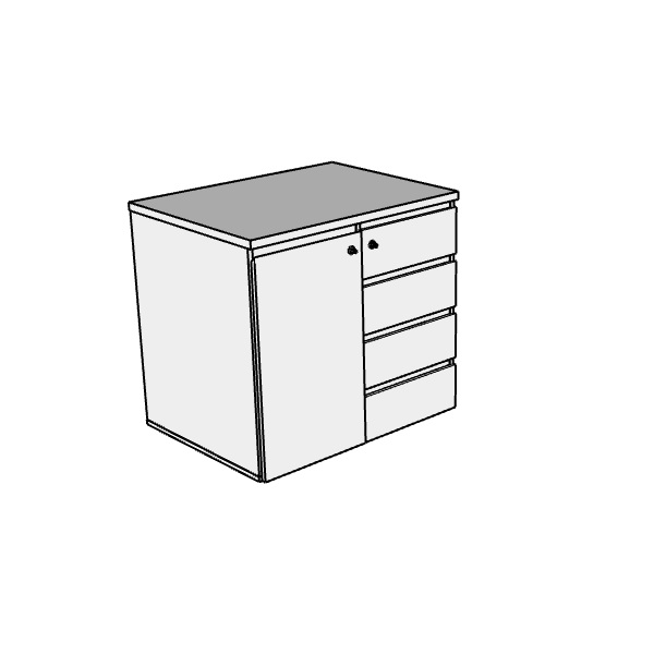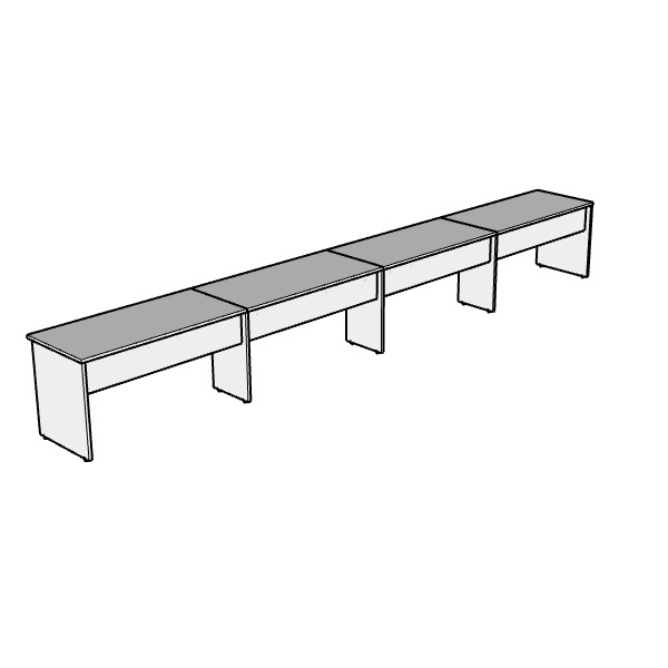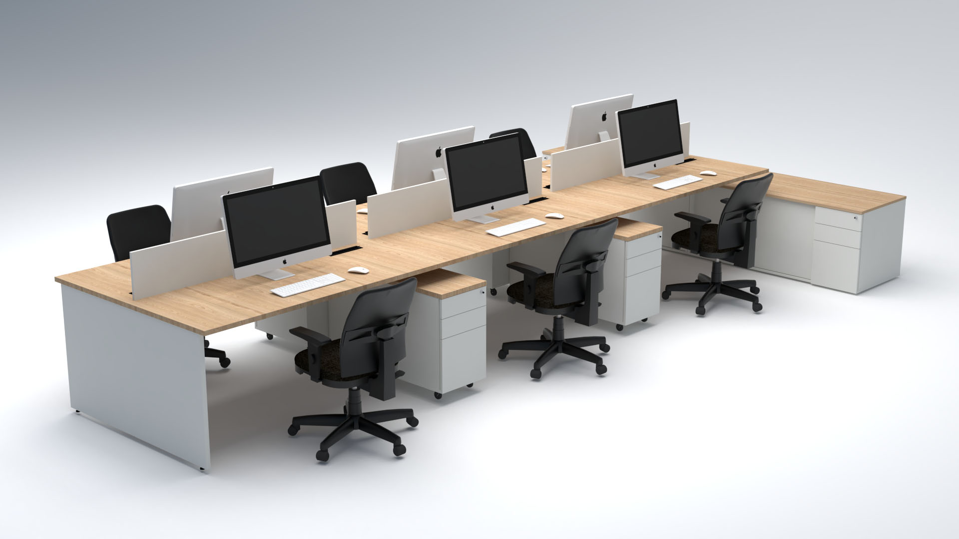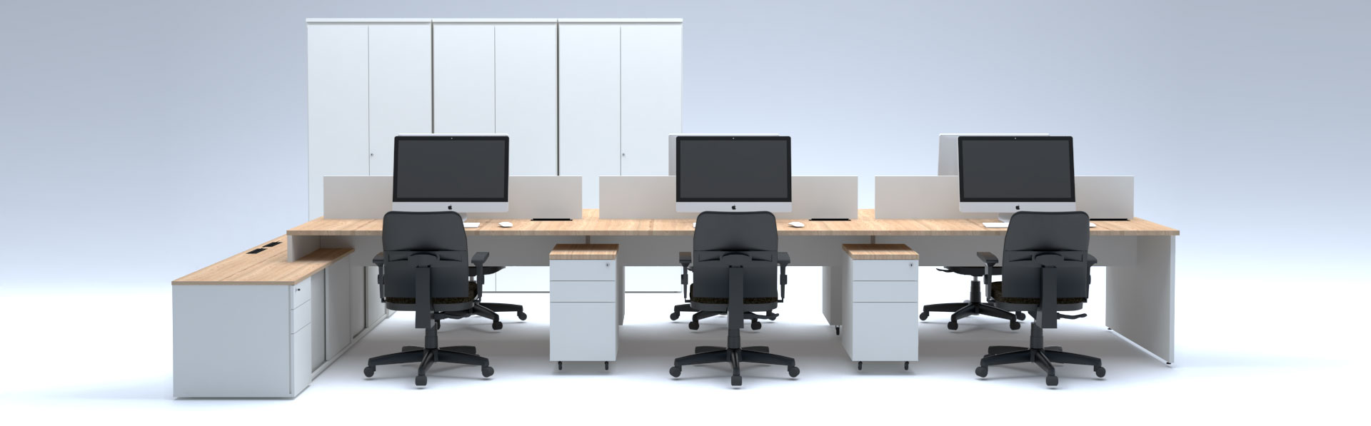 Linha operacional de baixo custo. Destaque para pés painel. Opções de estações de trabalho, mesas de gerência, atendimento e arquivos.