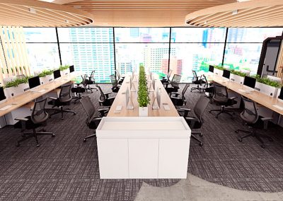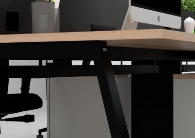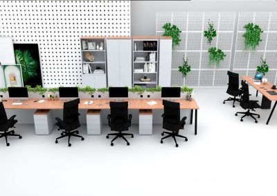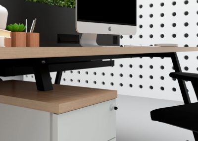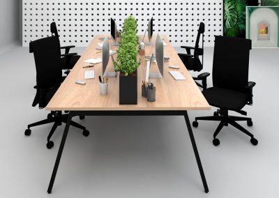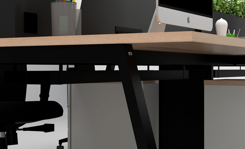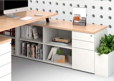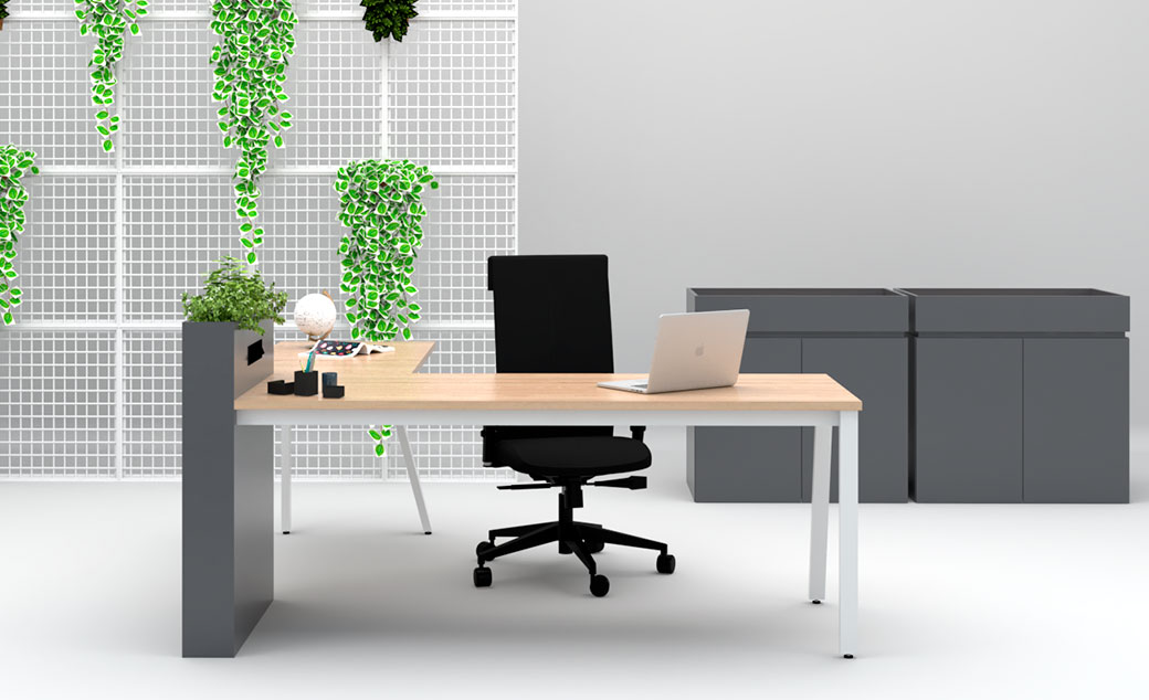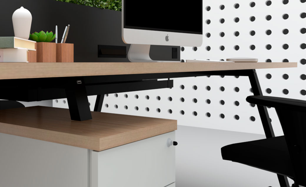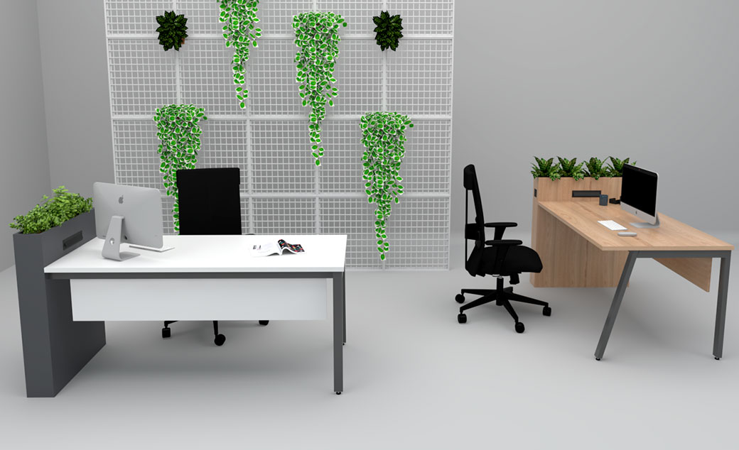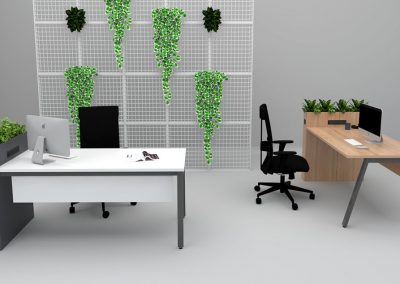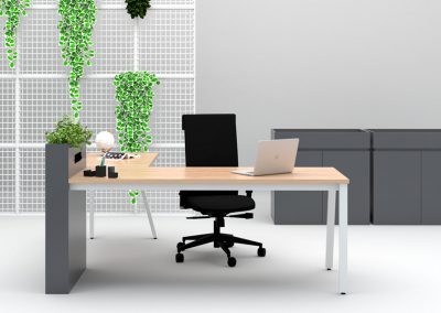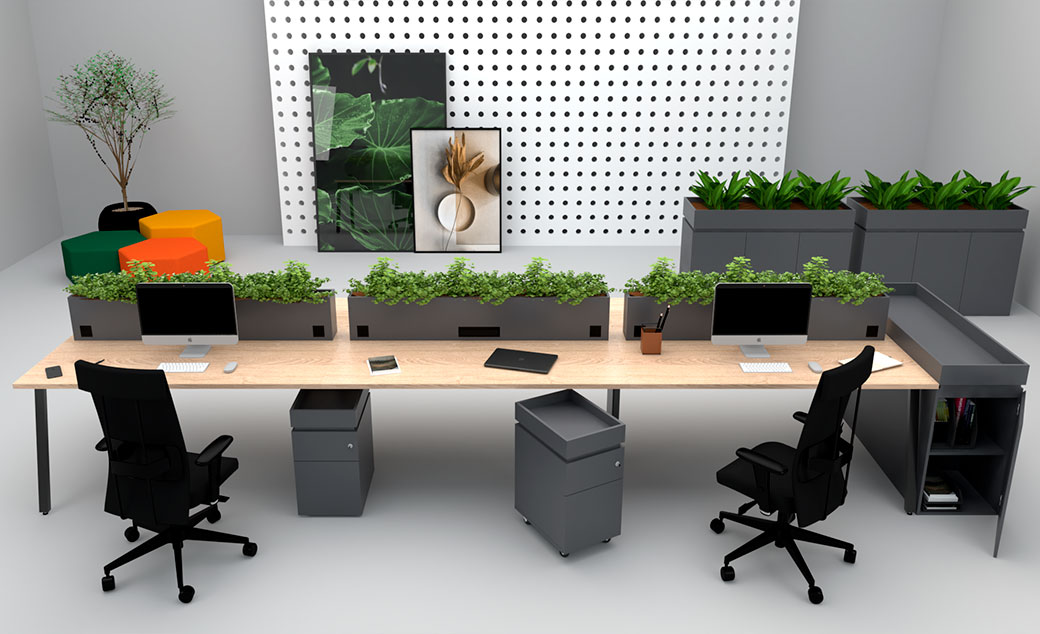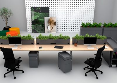Pensada para integrar natureza ao ambiente de trabalho, com foco na biofilia surge a linha Elementi. Em seu design se destacam os cachepos com caixas de tomadas, passa fio e fundo removível para manutenção, trazendo mais espaço livre nas mesas. Pés em metalon tubular, com opção de entrada USB extra nas extremidades.
