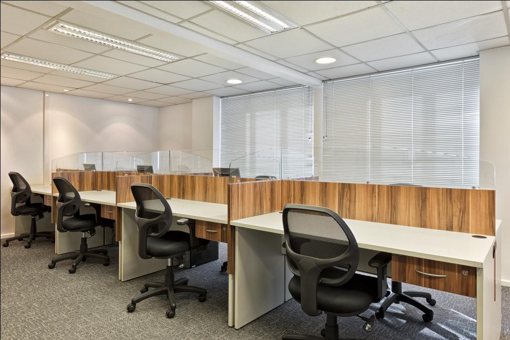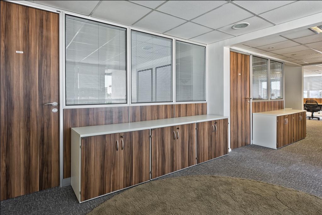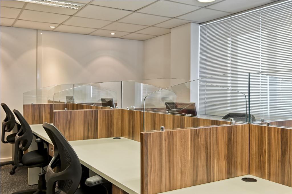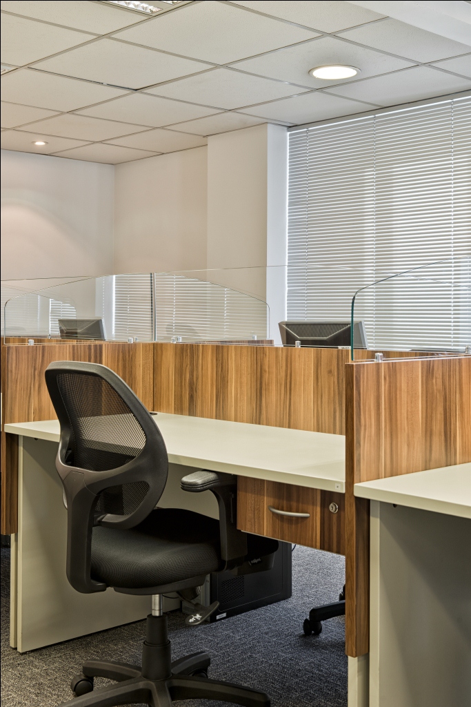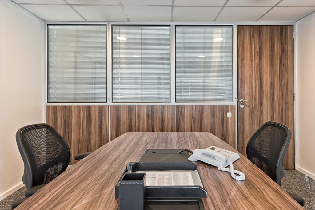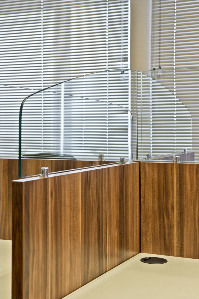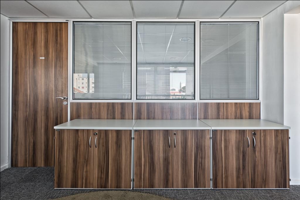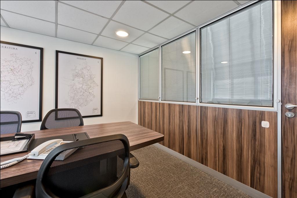 PRODUTOS: Sala comercial decorada com divisória S60 fosco, mesas, cadeiras, recepção e marcenaria corporativa.