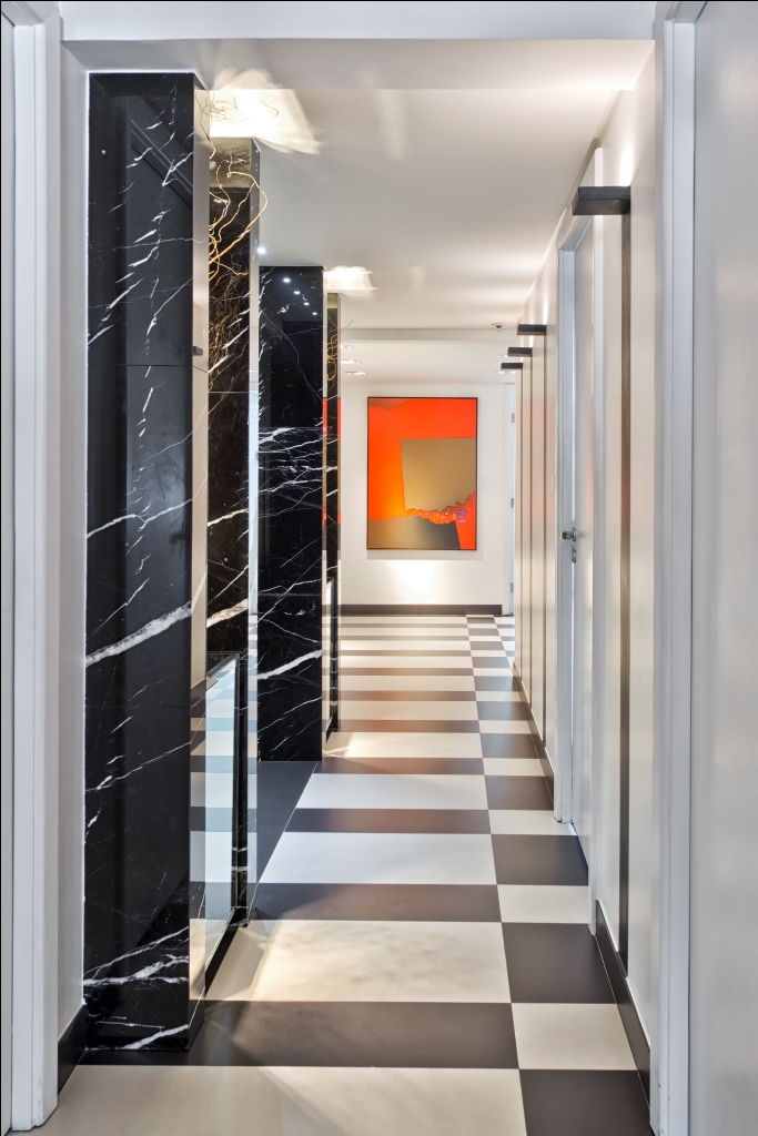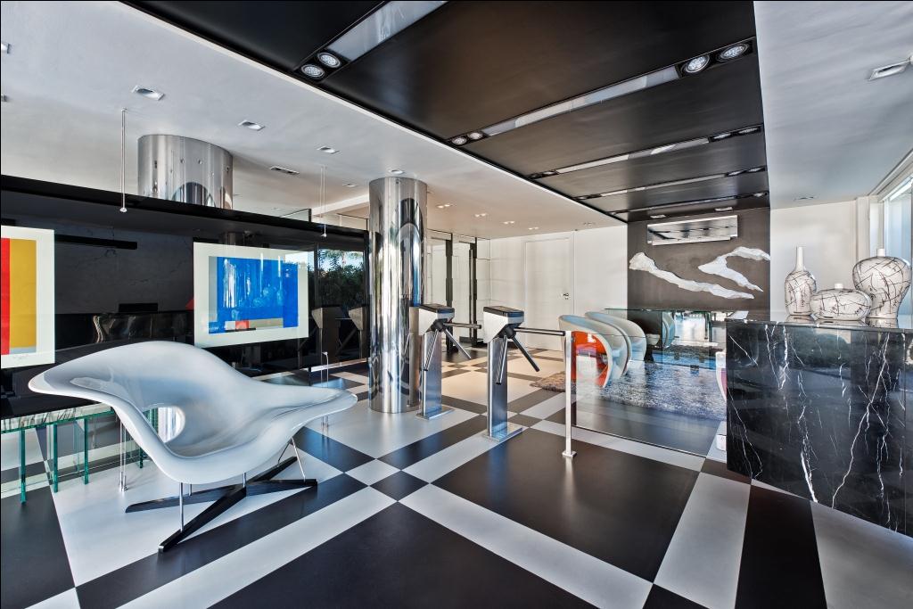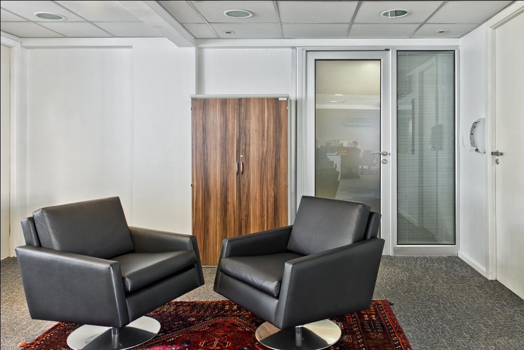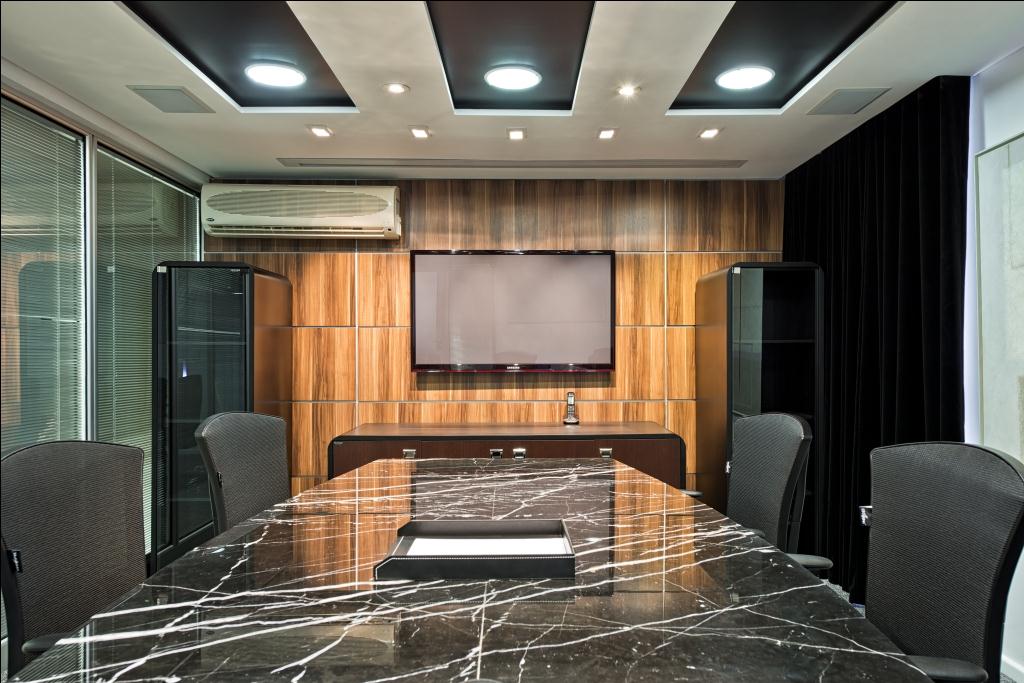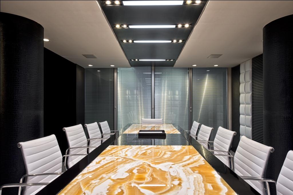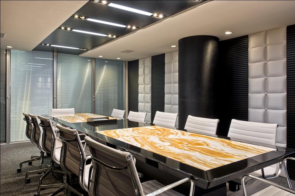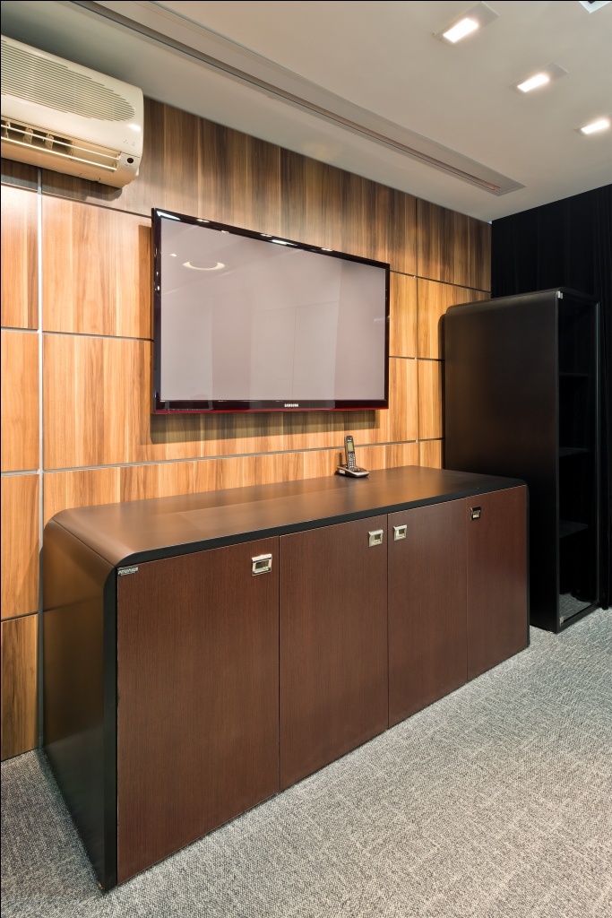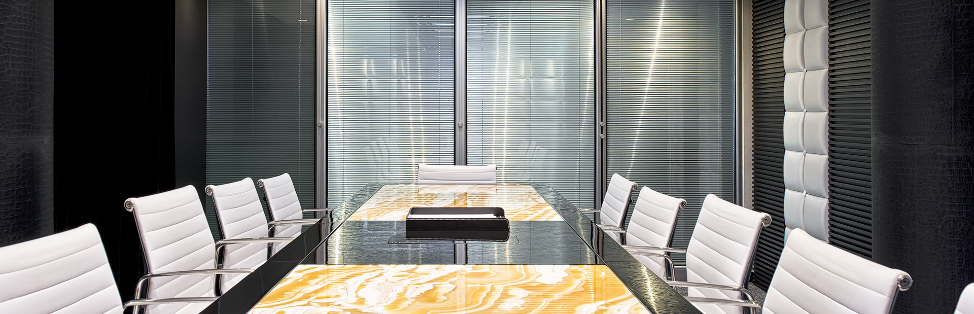 PRODUTOS: Sala comercial decorada com divisória S60 fosco, mesas, cadeiras, recepção e marcenaria corporativa.