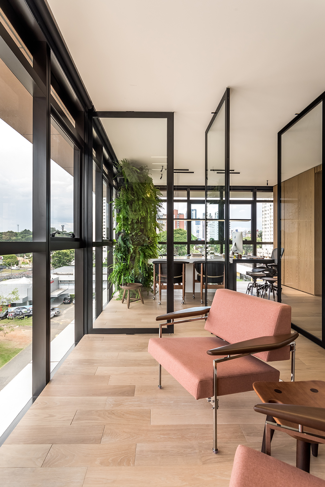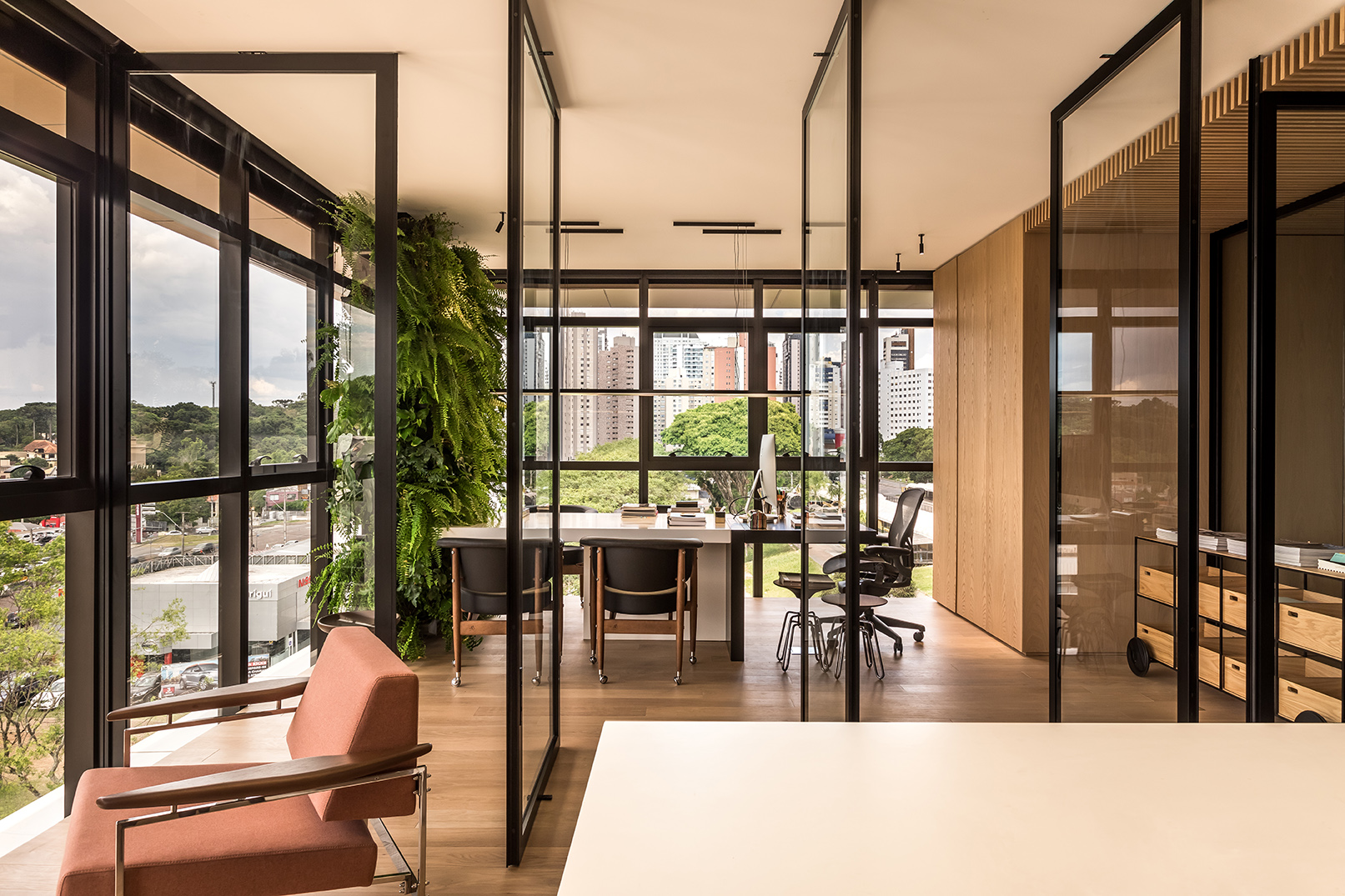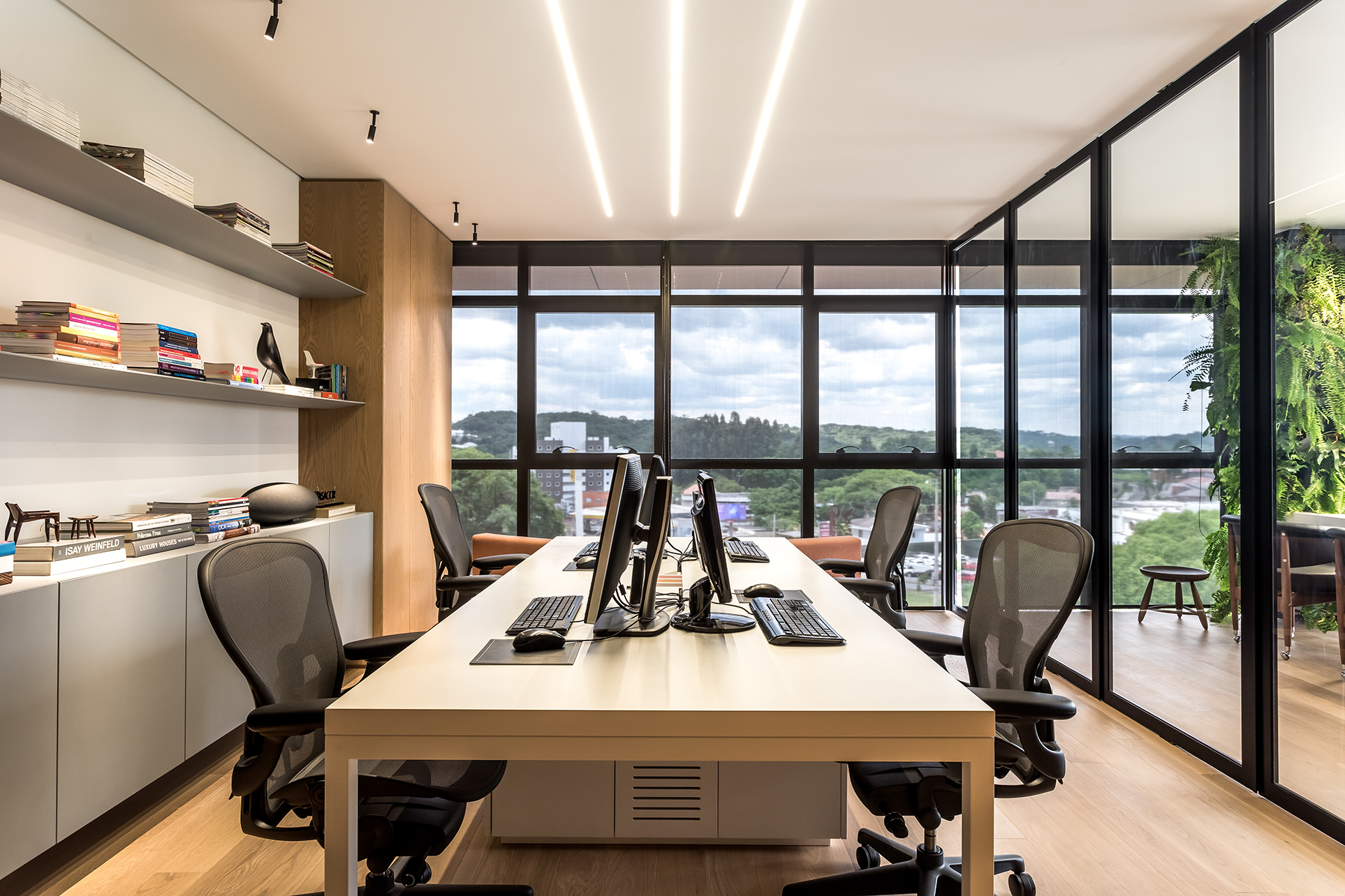 PRODUTOS: Divisórias articolato de vidro Lumina, mesas, estações de trabalho e marcenaria corporativa.